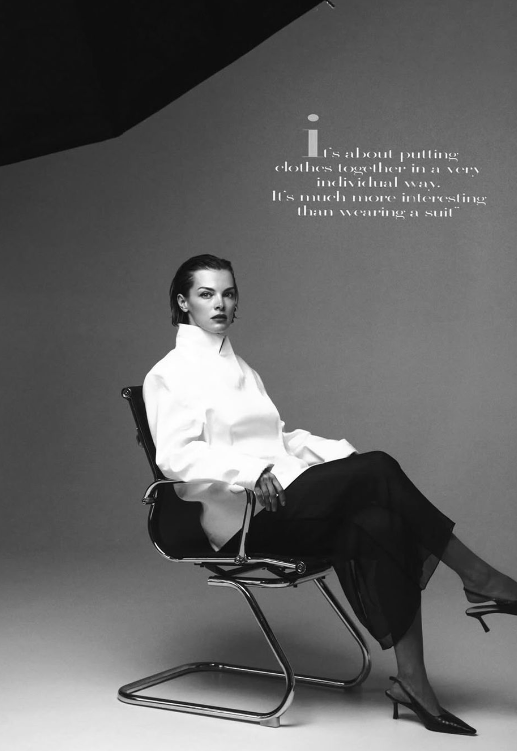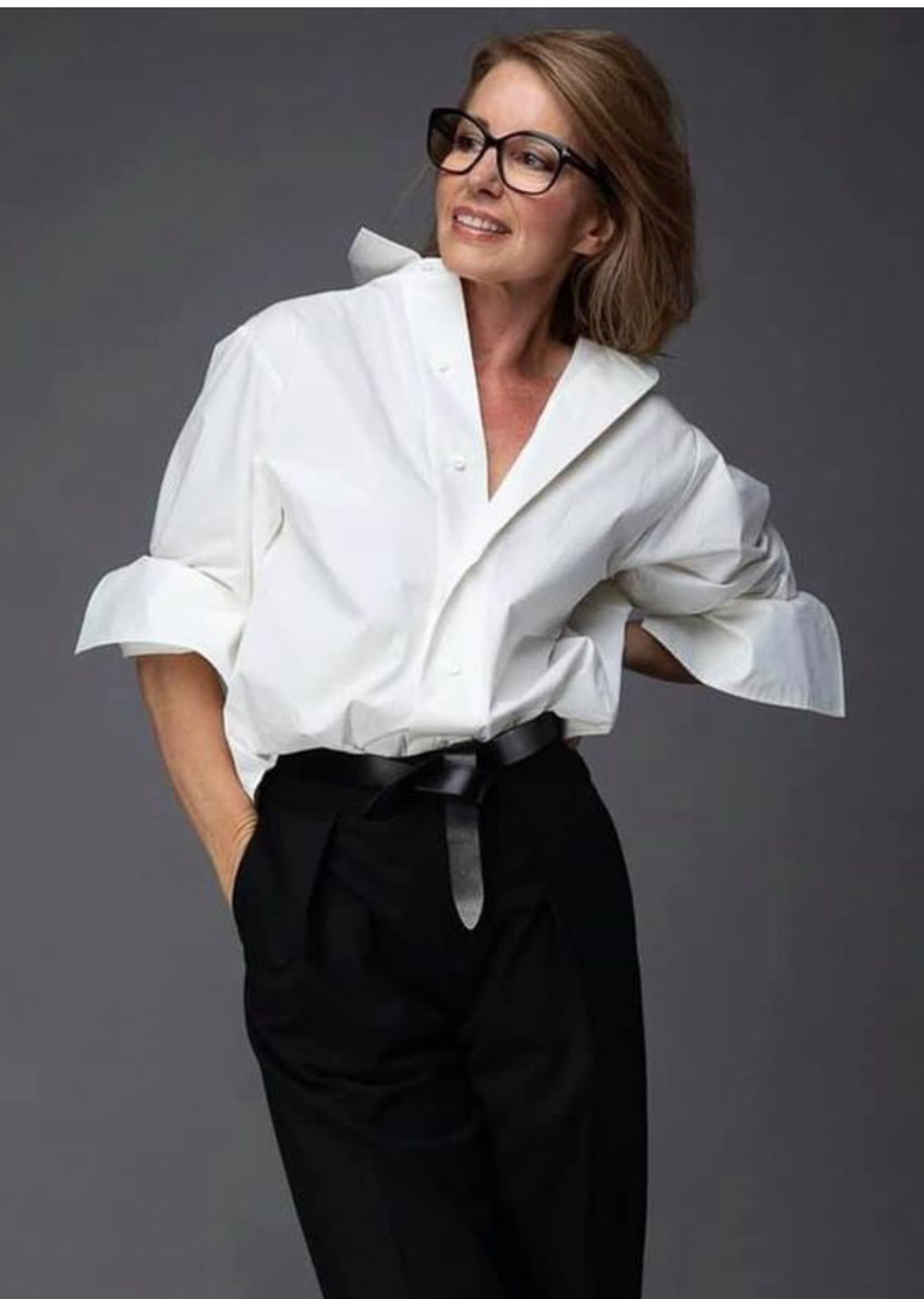 Абсолютная лаконичность и идеальный крой. Белая хлопковая рубашка мужского кроя, чёрный водолазный свитер, тёмные брюки прямого покроя. Ничего лишнего.